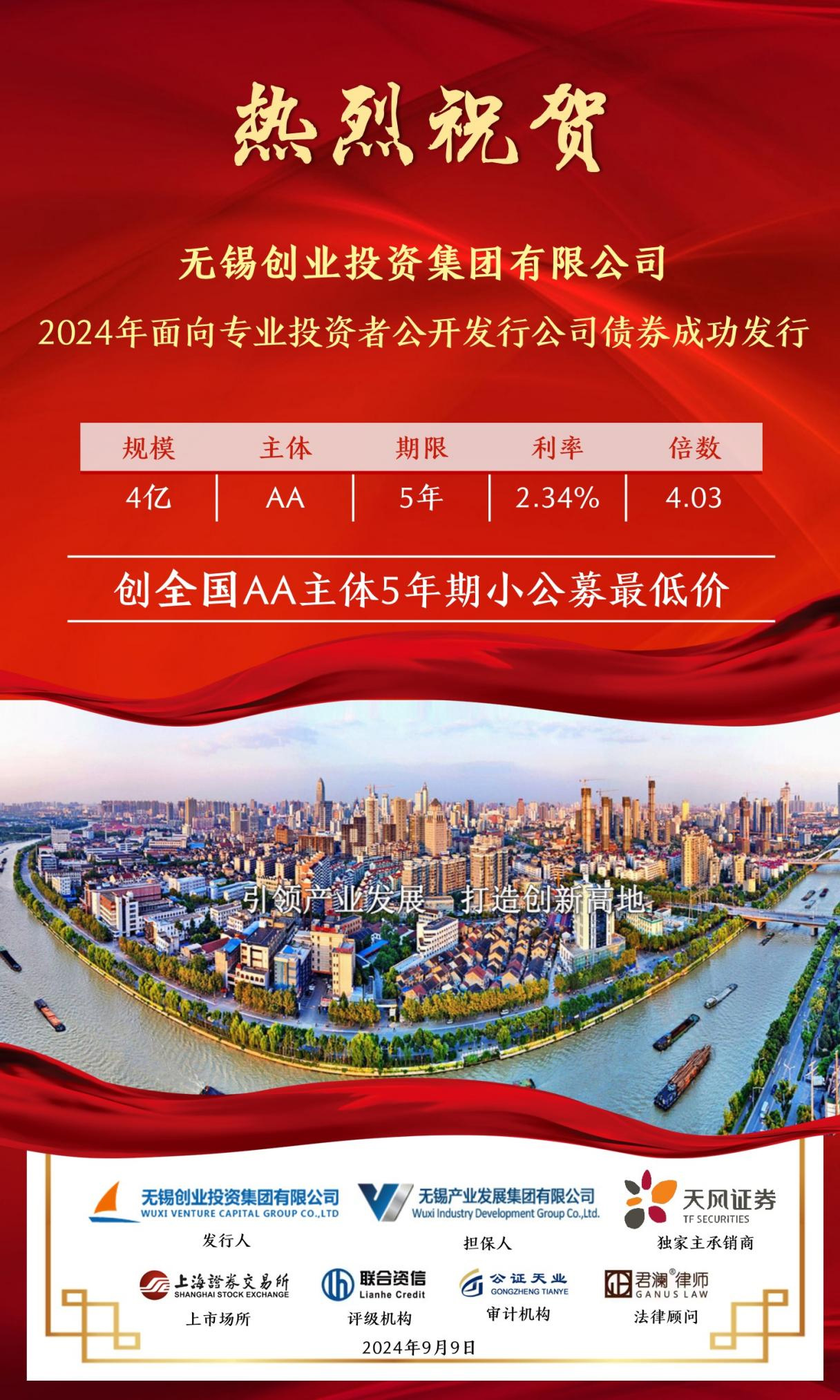 9月9日,無錫創(chuàng)業(yè)投資集團(tuán)有限公司(簡(jiǎn)稱“無錫創(chuàng)投集團(tuán)”)2024年面向?qū)I(yè)投資者公開發(fā)行公司債券“24錫創(chuàng)01”成功發(fā)行,發(fā)行規(guī)模4億元,發(fā)行期限5年,認(rèn)購倍數(shù)4.03倍,票面利率2.34%,創(chuàng)全國可比債券歷史發(fā)行最低利率!本期債券由天風(fēng)證券承銷,主體評(píng)級(jí)AA,債項(xiàng)評(píng)級(jí)AAA。 無錫創(chuàng)投集團(tuán)作為無錫產(chǎn)業(yè)集團(tuán)旗下的創(chuàng)業(yè)投資和股權(quán)投資平臺(tái),近年來在集團(tuán)的正確領(lǐng)導(dǎo)和大力支持下,圍繞無錫“465”現(xiàn)代化產(chǎn)業(yè)集群建設(shè),聚焦產(chǎn)業(yè)集團(tuán)“1+4+X”產(chǎn)業(yè)布局,持續(xù)深化產(chǎn)融協(xié)同合作,不斷提升資金使用效率,努力為公司高質(zhì)量發(fā)展提供更低成本、更長(zhǎng)周期、更加靈活的資金支持。未來,公司將繼續(xù)承擔(dān)國企社會(huì)責(zé)任,勇挑重?fù)?dān),發(fā)揮自身優(yōu)勢(shì),持續(xù)為無錫新質(zhì)生產(chǎn)力和實(shí)體經(jīng)濟(jì)高質(zhì)量發(fā)展注入新活力、增添新動(dòng)能。 |