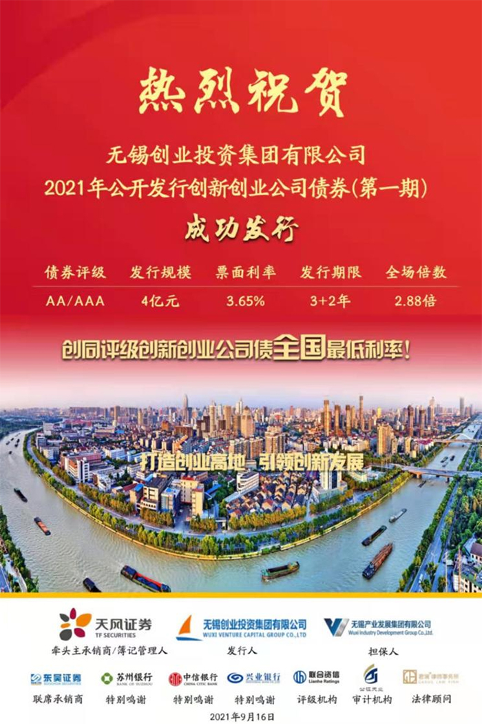 | 利率全國(guó)最低!無錫創(chuàng)投集團(tuán)成功發(fā)行創(chuàng)新創(chuàng)業(yè)公司債券 |