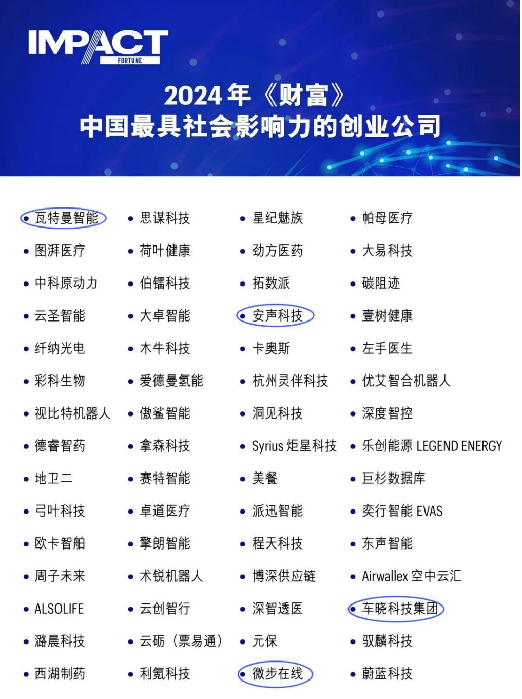 近日,全球著名商業(yè)雜志《財(cái)富》(Fortune Magazine)發(fā)布“2024年中國(guó)最具社會(huì)影響力的創(chuàng)業(yè)公司”榜單。創(chuàng)投集團(tuán)4家被投企業(yè)成功上榜,包括:瓦特曼智能、安聲科技、微步在線和車曉科技。