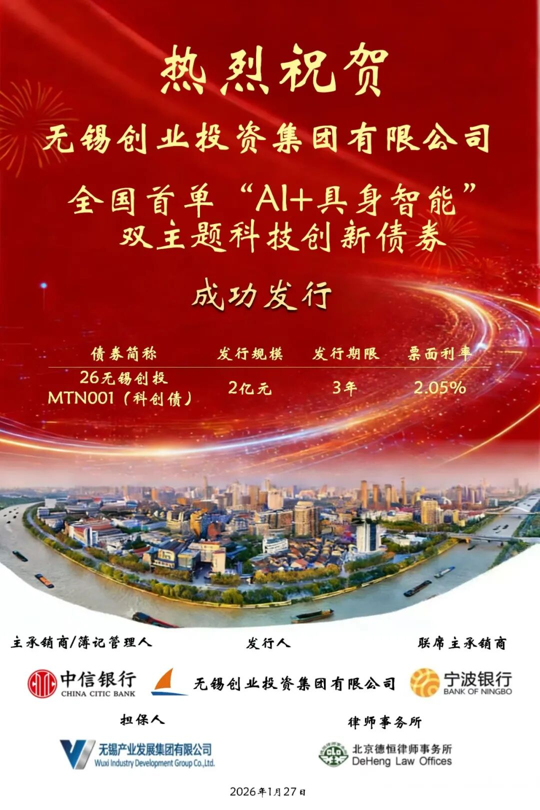 1月27日,全國首單同時聚焦“人工智能”與“具身智能”的主題科技創(chuàng)新債券在錫發(fā)行。無錫創(chuàng)業(yè)投資集團(tuán)有限公司成功發(fā)行2026年第一期中期票據(jù),規(guī)模2億元,集中投向人工智能與具身智能賽道。這是繼去年成功發(fā)行全國首批科技創(chuàng)新債券后,創(chuàng)投集團(tuán)再次運(yùn)用金融創(chuàng)新工具,精準(zhǔn)引導(dǎo)社會資本投向科技前沿,為無錫乃至長三角地區(qū)關(guān)聯(lián)產(chǎn)業(yè)發(fā)展注入動能。